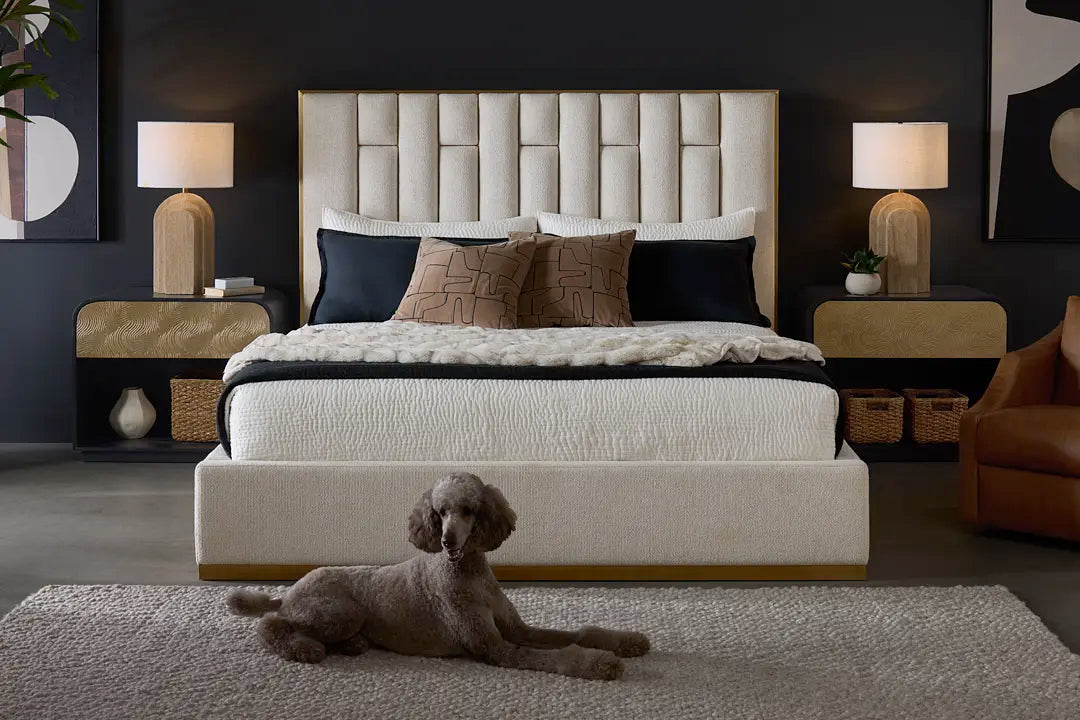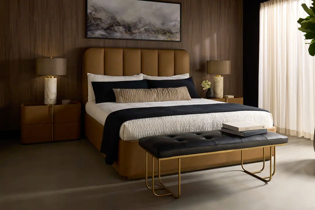 SUNPAN furniture products featured in this picture are: 112262 – Jamille Bed 112014 – Jamille Nightstands 106282 – Maverick Bench 112418 – Apollolina Table Lamp A0397 – Mystic Mountain