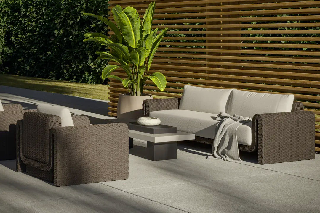 SUNPAN furniture products featured in this picture are: Cagliari Sofa, Cagliari Armchair, Dali Coffee Table, Dali End Table Small, Palma Hand Woven Rug 8x10, Arbor Planter Large, Arbor Planter Small