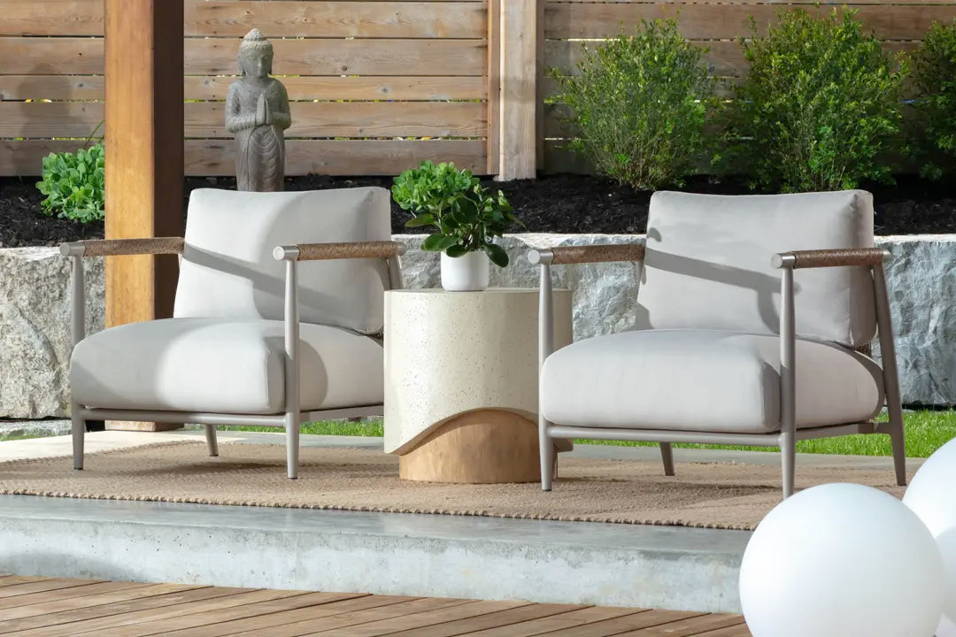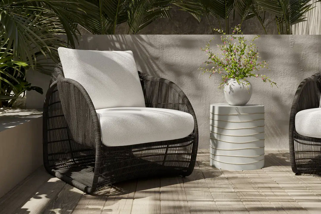 SUNPAN furniture products featured in this picture are: Valence Armchair, Brando Coffee Table, Rosen Planter, Alaska Hand-loomed Rug - 9' X 12'