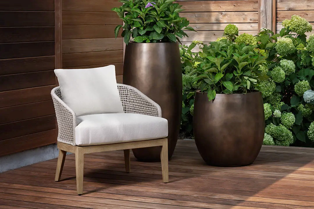 SUNPAN furniture products featured in this picture are: 110946-Capri Lounge Chair 111143-Aster Planter Tall 111147-Aster Planter Round