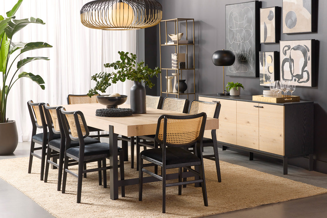 SUNPAN furniture products featured in this picture are: Palermo Dining Chair - Charcoal, Geneve Extension Dining Table Natural, Leballe Pendant Light Large, Miami Voice (Set Of 2) - 40 X 60, Gyre Hand Woven Rug Grey 10' X 14'