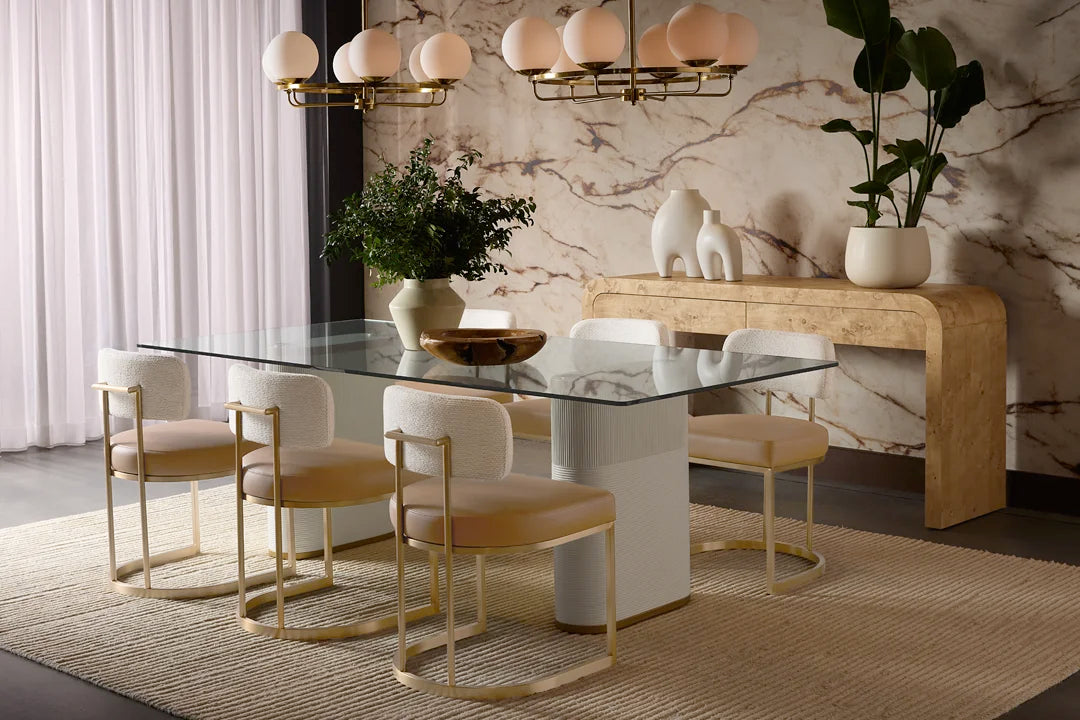 Sculptural chairs draped in luxe upholstery and chandeliers with gleaming gold accents capture the architectural precision of the era. Geometry and curves come together in perfect balance, creating spaces that feel both intentional and expressive.