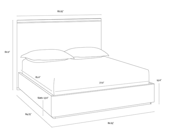 With clean lines and an alluring textured look, the Altman Bed reflects a refined expression of shape and form. Designed with a faux leather wrapped headboard. A dark grey oak veneer wood frame and a brass stainless steel inlay complete the look. No box spring is required and folding slats are included.