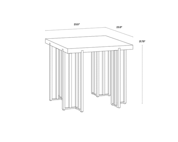 This square end table will bring warmth and style to various living and lounge spaces. The oak wood veneer top is complemented with architectural antique brass iron legs for added appeal. Cracks and deep lines in finish are part of the distressed look. Suitable for residential and contract environments.