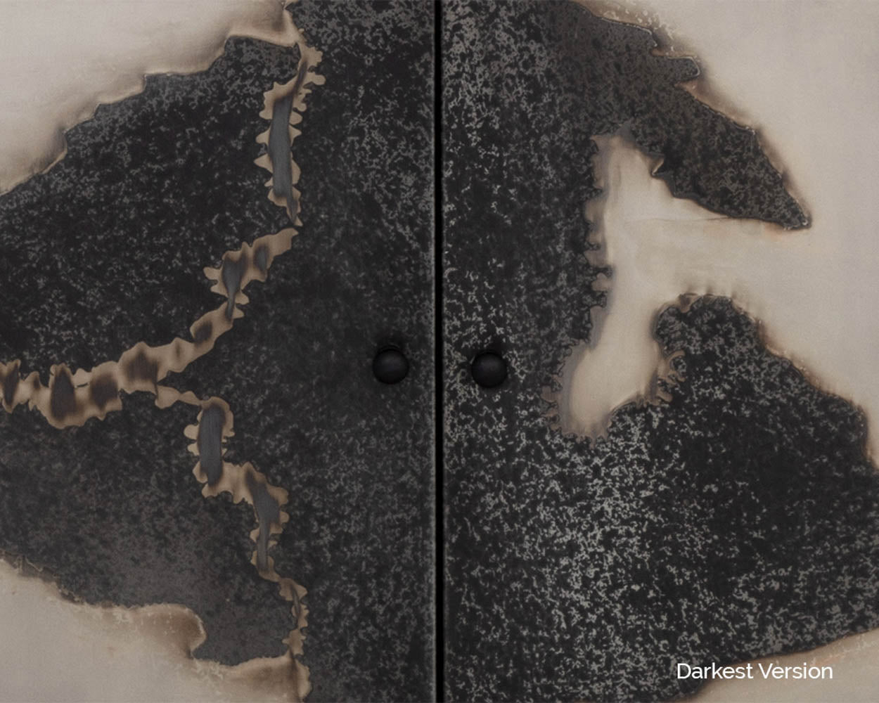 Make a bold statement with this unique bookcase. Cabinet feature a one-of-a-kind patina finish, boldly contrasted with a black iron frame. Made in India. With refined craftsmanship, this design was brought to life by skilled local artisans. By nature, these materials develop unique imperfections such as markings and colour variations for a truly one-of-a-kind piece. Pictures shown reflect the lightest and darkest variations of our Arlington patina finish. Actual product may range between these finishes.