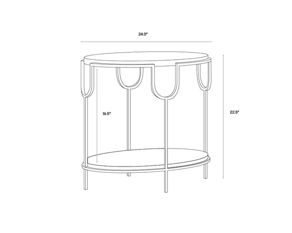 This oval shaped end table features a beautifully structured antique brass iron frame with a concrete top and shelf. A dramatic yet refined contemporary piece. Crafted from a natural concrete mix, each piece will look different. Variations in colour, texture, imperfections, surface scratches and non-structural hairline cracks are considered inherent and valued qualities of the material.