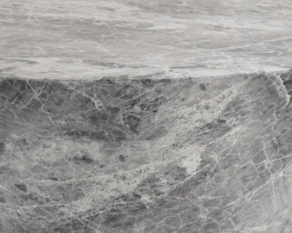 A tapered design on this round concrete end table creates a bold but defined look. Made with a grey marble look finish.