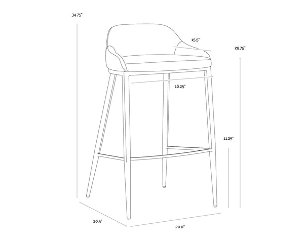The Astra Barstool is distinguished by its strong modern silhouette and sleek black powder-coated iron legs. Smooth ivanhoe pine faux leather wraps around a comfortable low back seat.