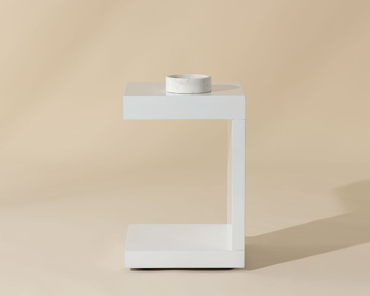 This simple but very functional c-shaped table with drawer can be used with a sofa, chair or even as a nightstand. Stocked in high gloss white. Also available in espresso and driftwood. Castors are included.