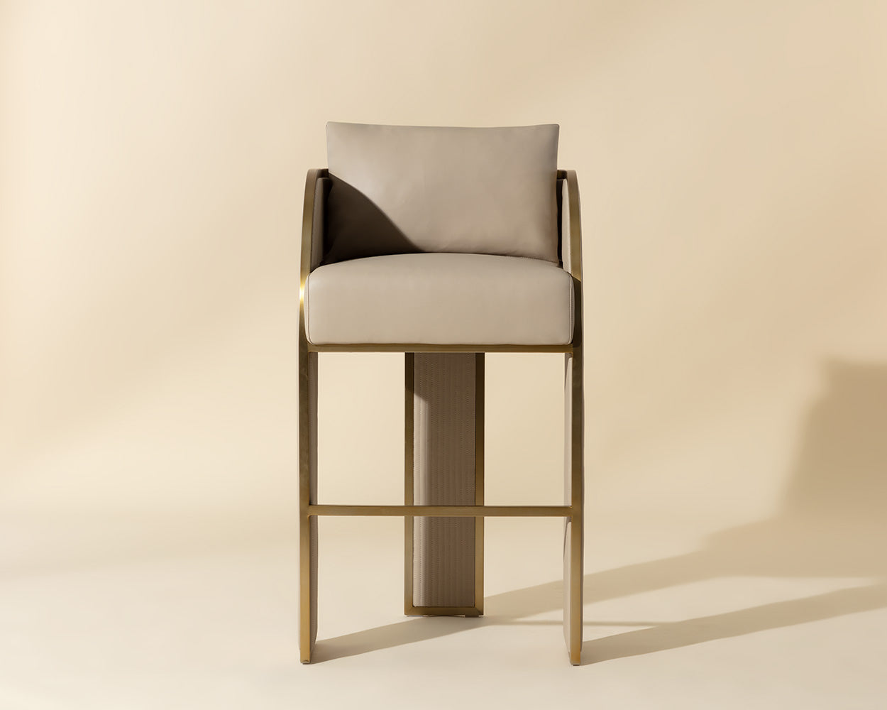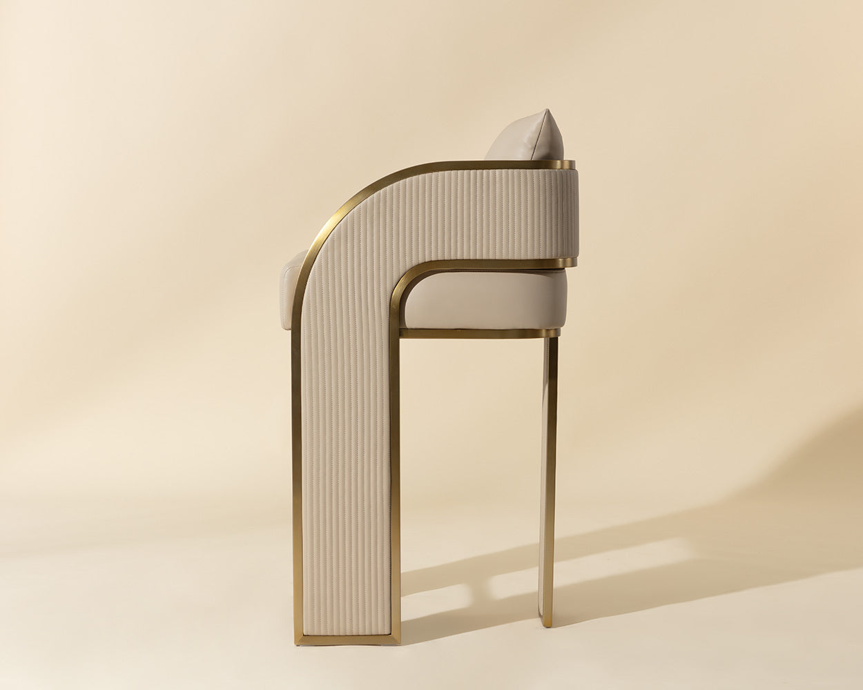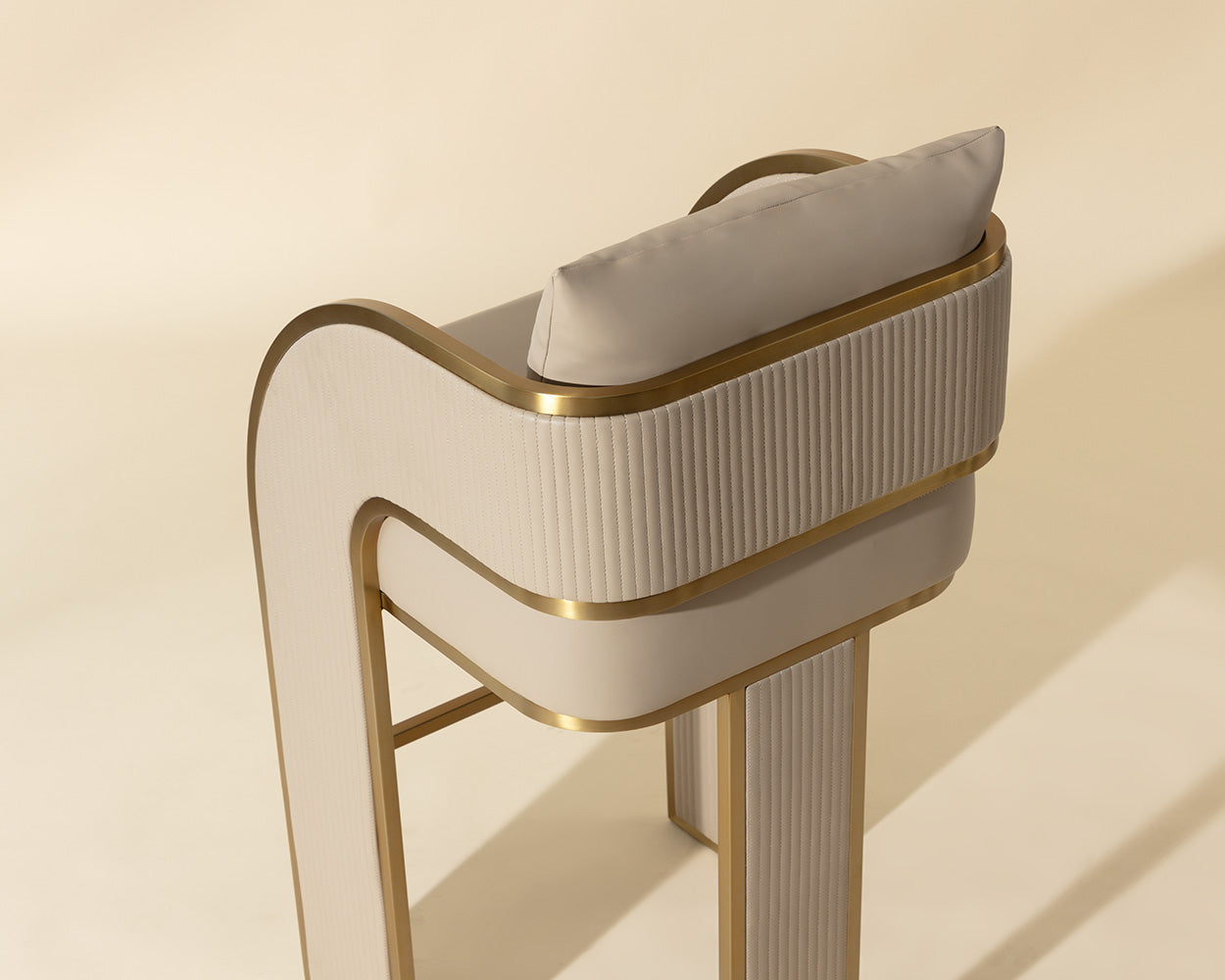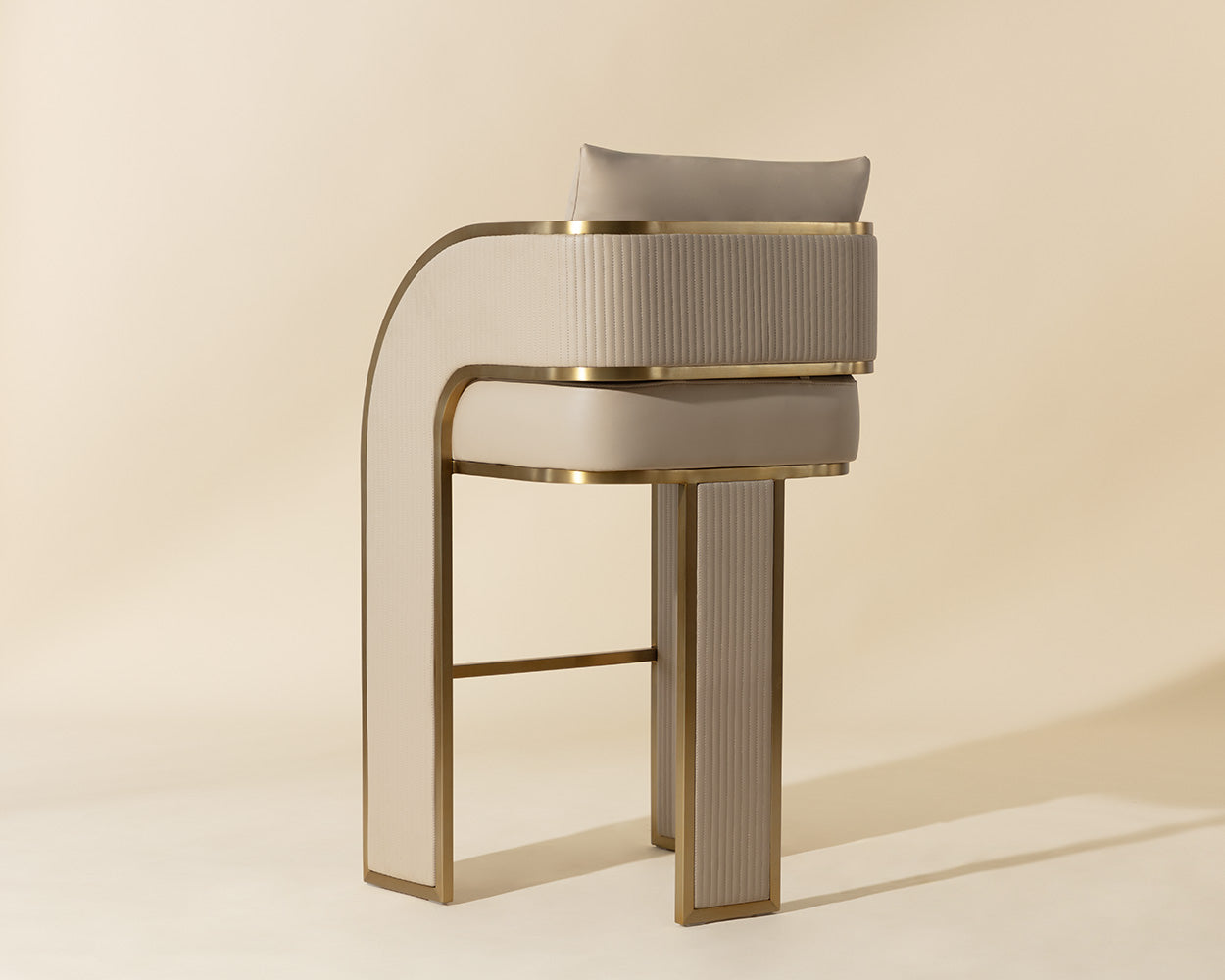 Bold and stylish, the Baz Barstool is sure to turn heads. Featuring a daring silhouette upholstered in napa black faux leather. Gold stainless steel detailing and channel stitching add depth and visual impact to the overall look of the piece.