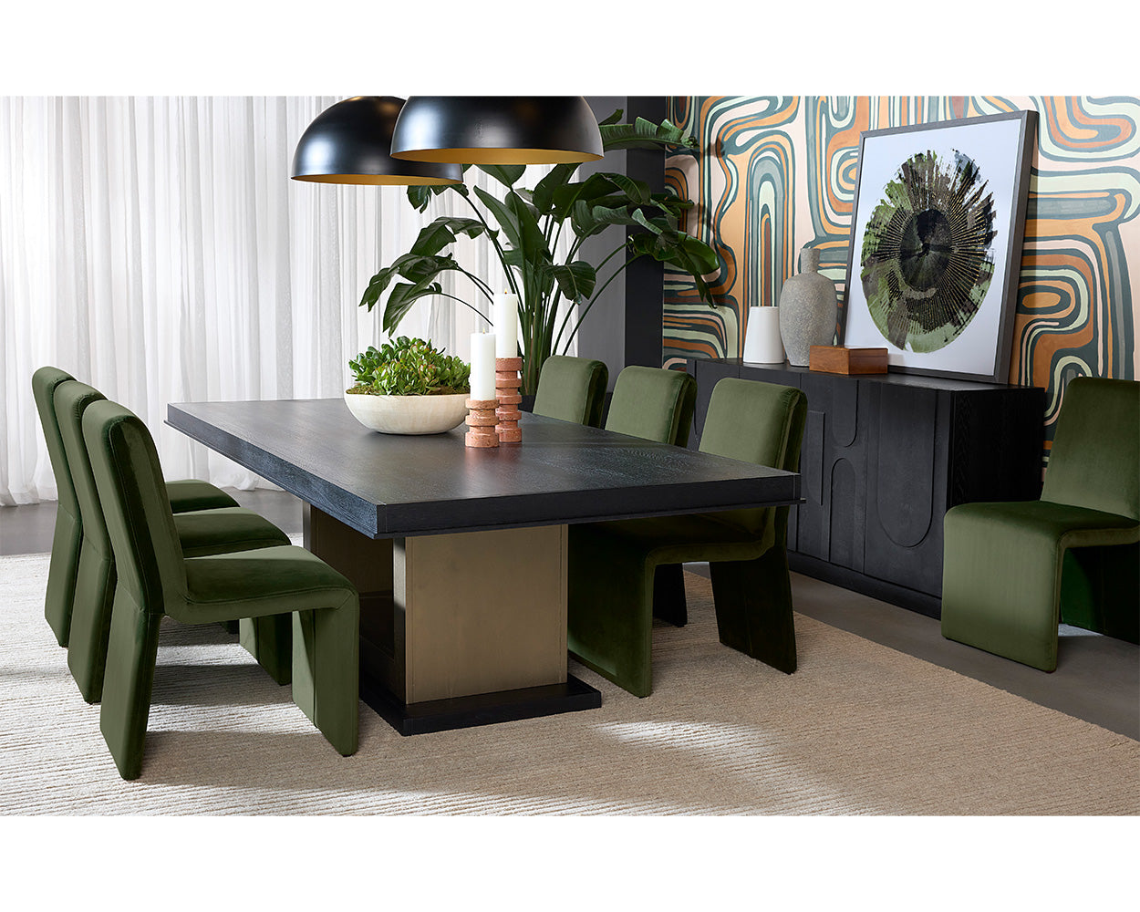 Create an alluring dining space with this modern dining chair that features an intriguing silhouette. Stocked in effie linen fabric with a fully upholstered wooden base.