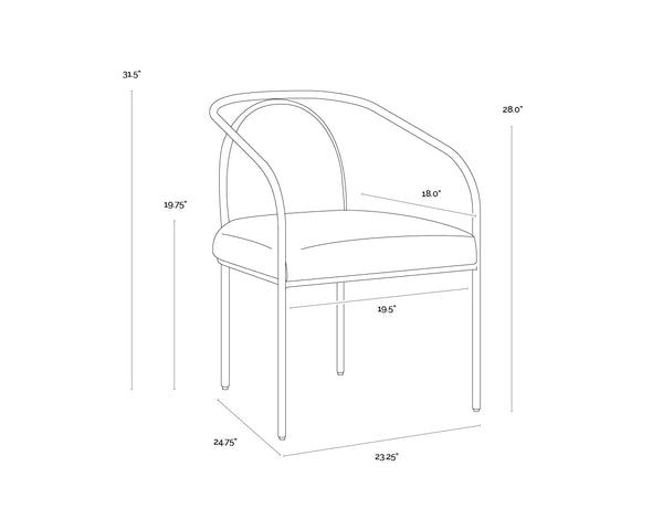 The Cicero Dining Armchair is a lesson in understated elegance. Sleek gold stainless steel paired with the warm brown tones of milliken cognac faux leather creates a captivating look to elevate any dining space.