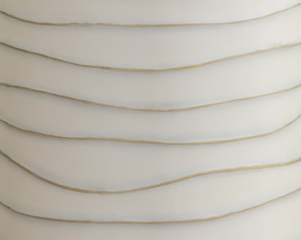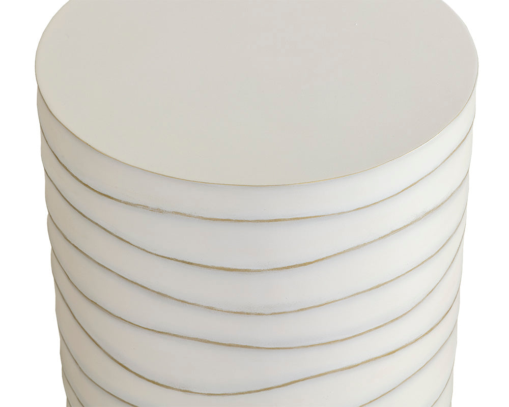 This round side table will create a moody environment. Crafted from concrete, this piece features hand sculpted ridges with a painted brass finish. The perfect addition to living, lounge and office spaces.