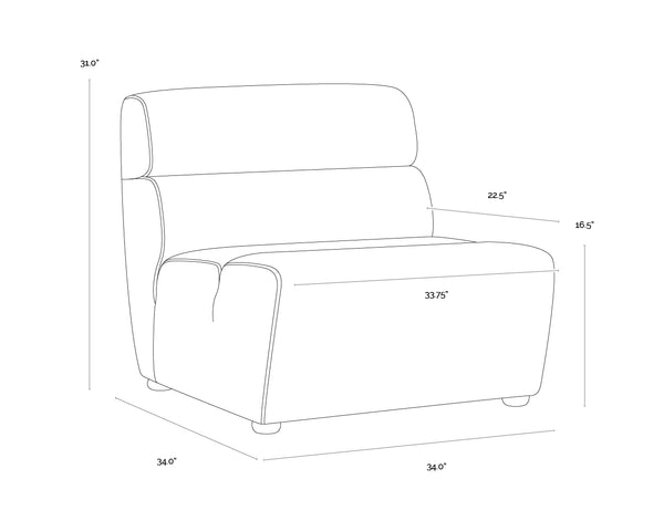 This modular armless chair allows for modern creativity. This piece can be sourced alone or in a variety of combinations with the coordinating Cornell corner chair and ottoman sectional pieces. A stylish and comfortable addition to large and small living, lounge, and lobby spaces. Stocked in polo club stone performance fabric. Performance fabric is moisture repellent, durable and easy to clean. Also available as a sectional set.