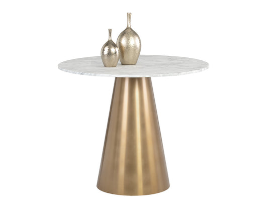 An absolutely stunning tapered bar table. Crafted with a brushed gunmetal base and a stunning white marble top to elevate any contemporary dining or lounge space. Suitable for residential and commercial environments. As marble is a natural material, unique veining, pitting, fissures, micro-cracks and colour variations are all characteristics that add to the uniqueness and beauty of each piece.