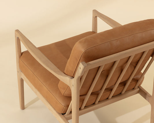 A bold and masculine lounge chair crafted in Vietnam. Features a mid-century inspired frame in black solid oak wood with a black leather seatback. Button tufting completes the look. Handle with Care: This design has been crafted with leather. Leather is a natural material; as such, colour variations, markings, wrinkles, grooves and light scratches are acceptable and appreciated characteristics. No two pieces are alike. Visit our Product Care page for more information on how to ensure the lasting beauty of this piece.