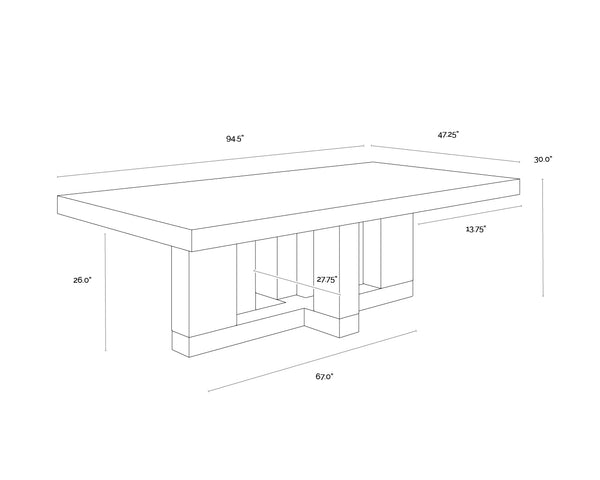 Overall Dimensions | 94.50W x 47.25D x 30.00H in 240.03W x 120.015D x 76.2H cm |