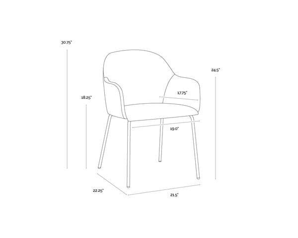 A clean and scompact dining armchair that features a modern and urban style. Stocked in mina warm grey fabric completed with powder-coated metal legs in a matte black finish.