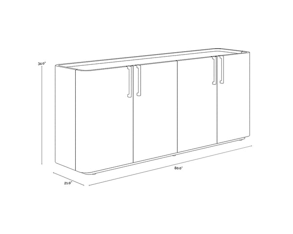This contemporary sideboard is defined by its beautiful and gentle curves. Wrapped in cream faux leather with a brown oak veneer tabletop that is sure to impress. Includes four cabinets and completed with a solid acacia wood base. Handle With Care: This design has been crafted with faux leather. Faux leather is manufactured to reflect the natural characteristics of leather; as such, colour variations, markings wrinkles, grooves, and light scratches are appreciated characteristics. No two pieces will be alike. Visit our Product Care page for more information on how to ensure the lasting beauty of this piece.