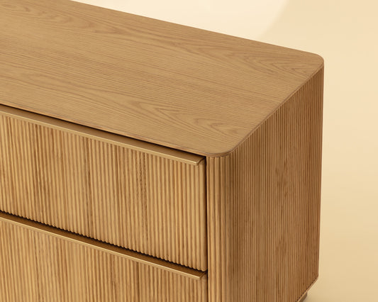 The Kalla Sideboard brings form and function to life. Crafted with a rustic oak veneer with vertical reeding. A gold steel base finishes the look. Featuring added drawers and shelving for ample storage space. As wood is an organic, porous material, these pieces will contain natural variation of texture and may also exhibit fine indentations and cracks. Wood pieces will also display a disparity of colour and grain, and visible knots and burls that add to the character of each piece.