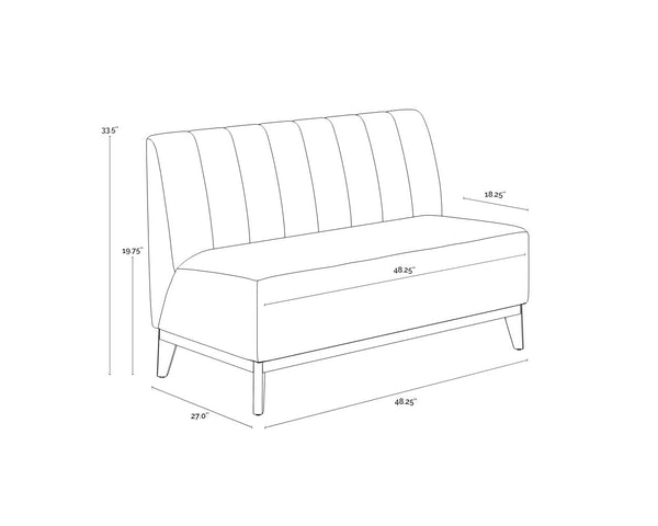 Elegantly designed, the Kosovo Banquette exudes luxe comfort. Upholstered in abbington navy fabric with vertical tufting, and completed with brown birch wood legs. As wood is an organic, porous material, these pieces will contain natural variation of texture and may also exhibit fine indentations and cracks. Wood pieces will also display a disparity of colour and grain, and visible knots and burls that add to the character of each piece.