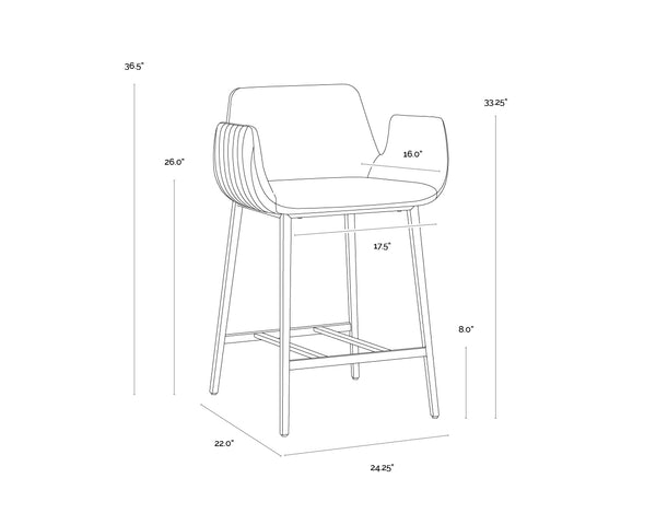 With its stunning scooped design, the Lucano Counter Stool is an impressive addition to any dining space. Features vertical channel tufting on exterior seat. Stocked in smooth bravo black faux leather and completed with gold stainless steel legs.