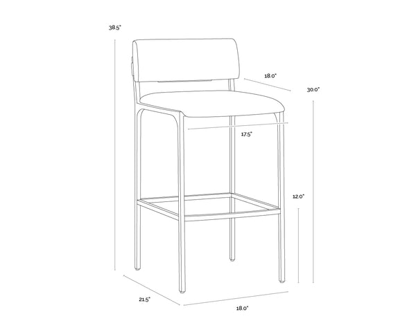 The untold beauty of the Mori Barstool lies in its unassuming details. The subtly extended seat and foam-padded backrest are upholstered in smooth abbington black fabric for enduring comfort. At the back, the gold powder-coated steel frame is elegantly wrapped in nappa black faux leather, accented with eyelets and rope detailing for a sophisticated touch.